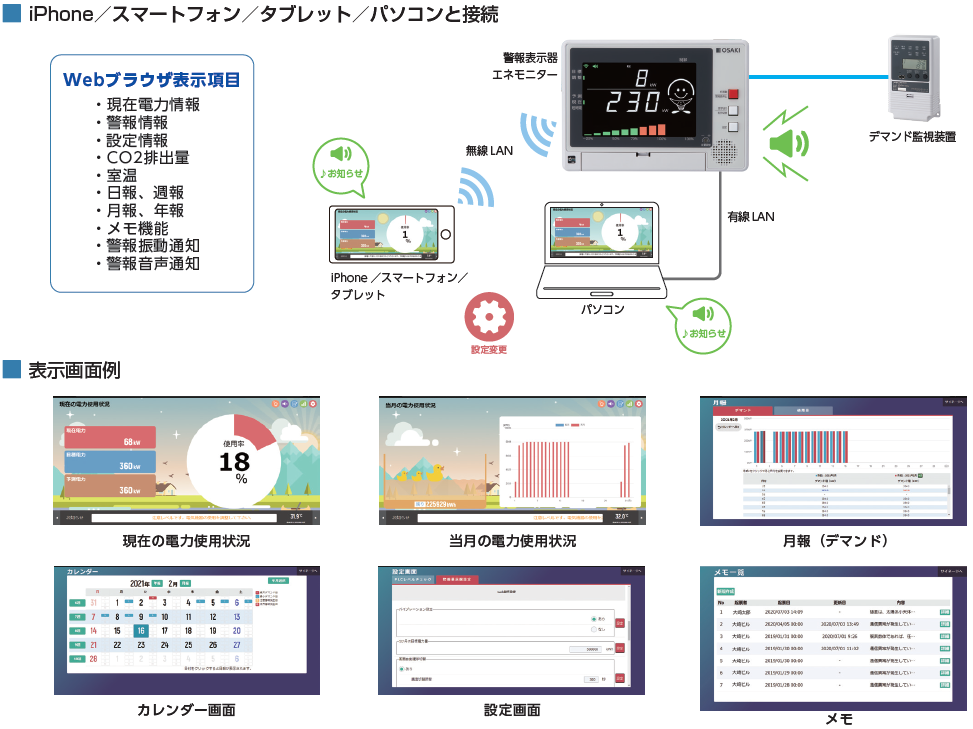 - 無線/有線LAN通信機能を搭載で操作性向上。PCやスマートフォンのブラウザから本装置へアクセスすることで、手軽に電力使用状況を確認が可能になりました。さらに設定変更も可能です。