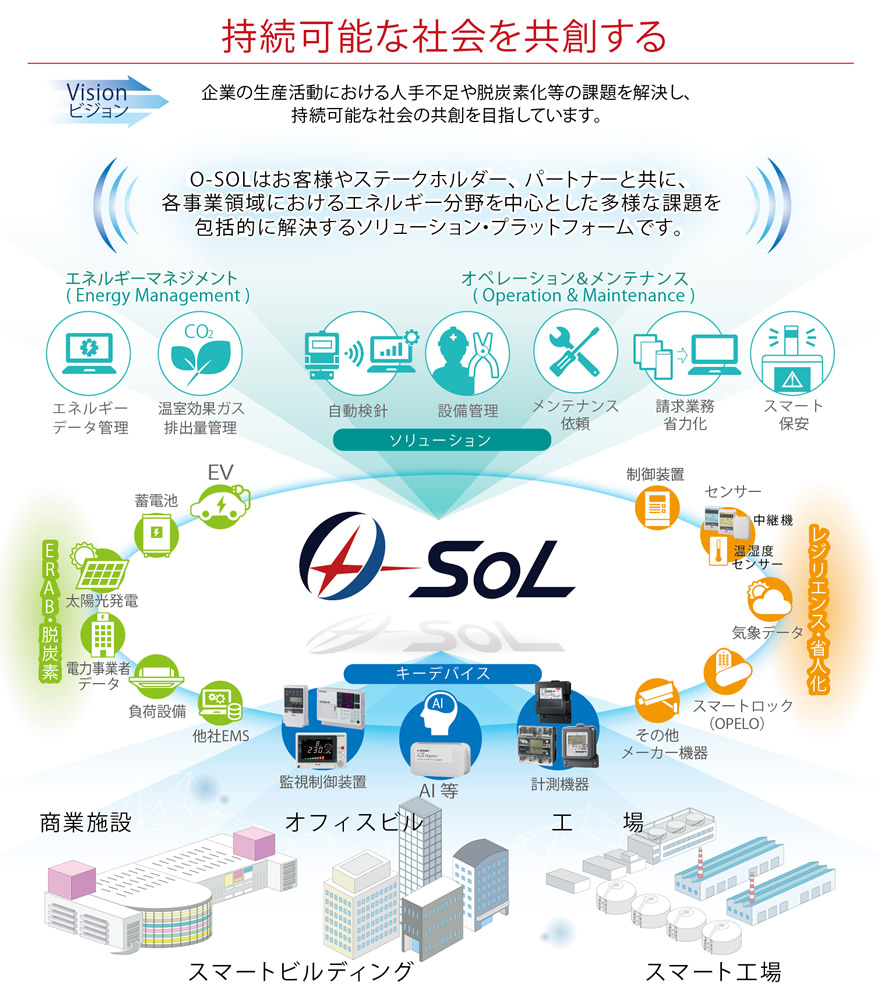 O-SOL(オーソル)は脱炭素化や企業の人手不足などの課題を解決し、持続可能な社会の共創を支援するプラットフォームです。 エネルギーマネジメントシステム(EMS)やスマートメータリングシステム(SMS)と連携してエネルギーを正確に把握し、的確なアクションで最適化を支援します。