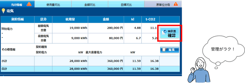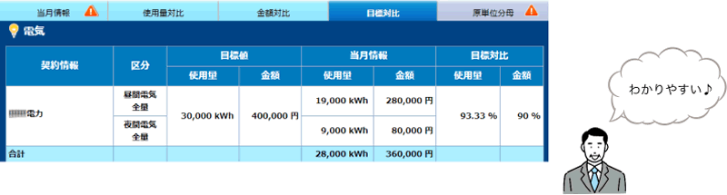 前年同月の使用量・請求金額や設定した目標値で比較ができ、月ごとの進捗管理ができます。
