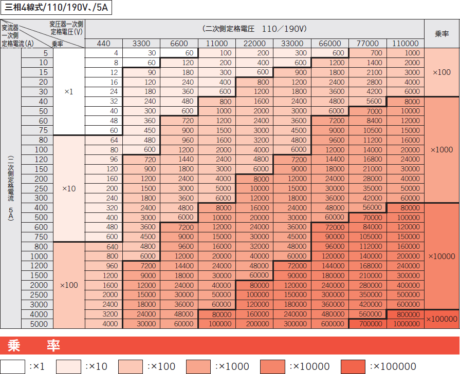 注1)太線はJISの標準乗率を示します。 注2)合成変成比倍の場合の乗率は、表中の合成変成比の値と同じです。 また、1/10合成変成比倍の場合の乗率は、表中の合成変成比を10で割った値となります。 注3)三相4線式の変圧器一次側定格電圧は相電圧を示します。