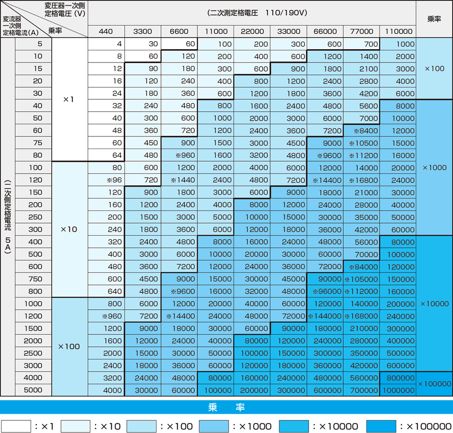 注1)太線はJISの標準乗率を示します。 ※印部分は、変成比定数倍率を0.1に設定して下さい。 注2)合成変成比倍の場合の乗率は、表中の合成変成比の値と同じです。 また、1/10合成変成比倍の場合の乗率は、表中の合成変成比を10で割った値となります。 注3)三相4線式の変圧器一次側定格電圧は相電圧を示します。