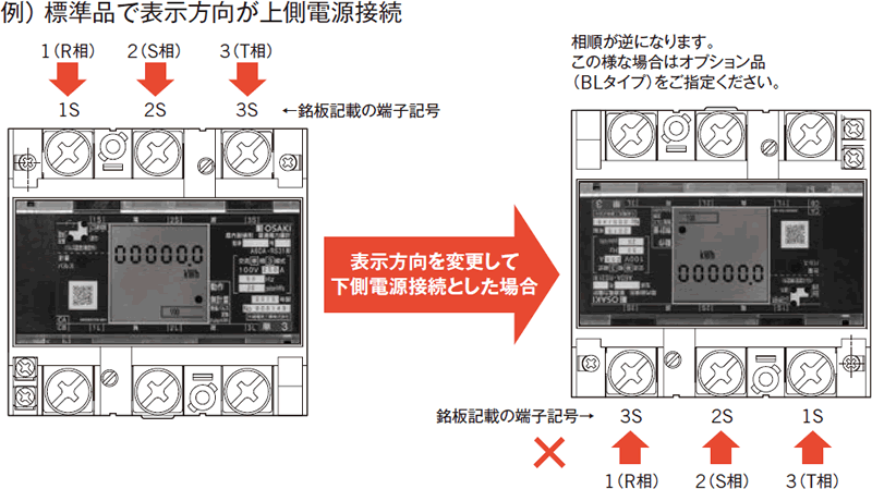 下図のように、1S-1L(R相)と3S-3L(T相)の相順を変えて結線する場合は、相順を入れ替えた製品(標準品⇔1S-3Sを入れ替えたBLタイプ)がありますので、必要に応じてご指定ください。