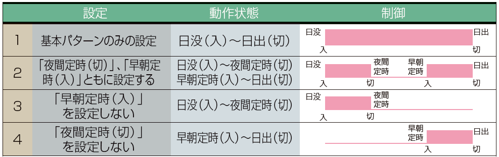 日没「入」~日出「切」の基本パターンに加えて、夜間定時「切」、早朝定時「入」機能がありますので、これらの組合わせによりできる4つの制御パターンから選択できます。(任意時刻の 「入」 「切」 設定も可能です。)