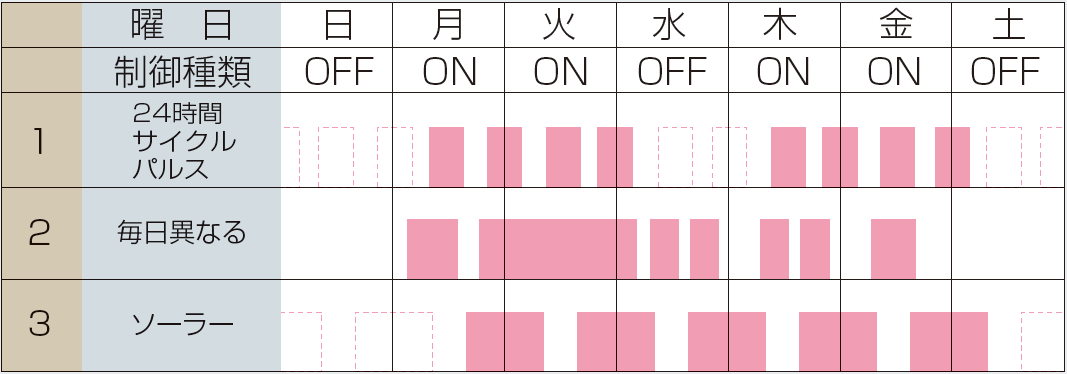 ●タイムスイッチの「入」「切」の組み合わせで1動作となります。