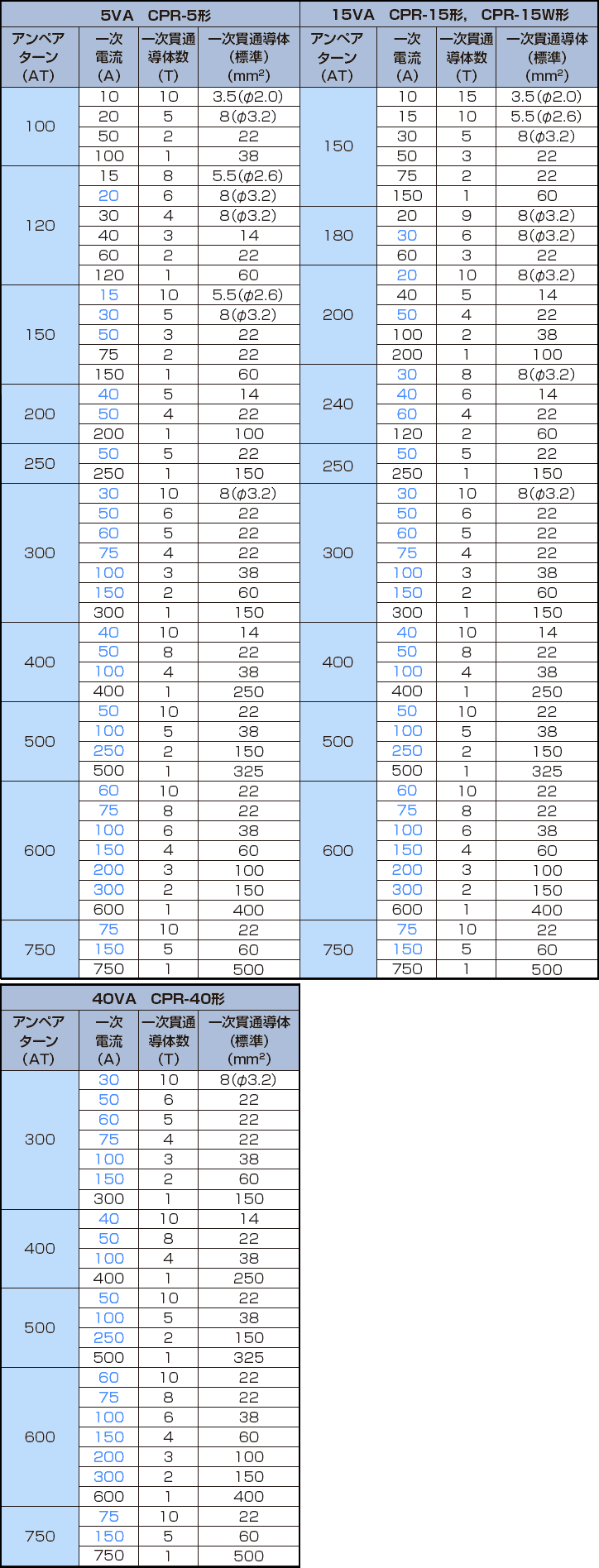 (1)アンペアターン(AT)、定格一次電流(A)および一次貫通導体数(T)の組み合わせは下表のとおりです。