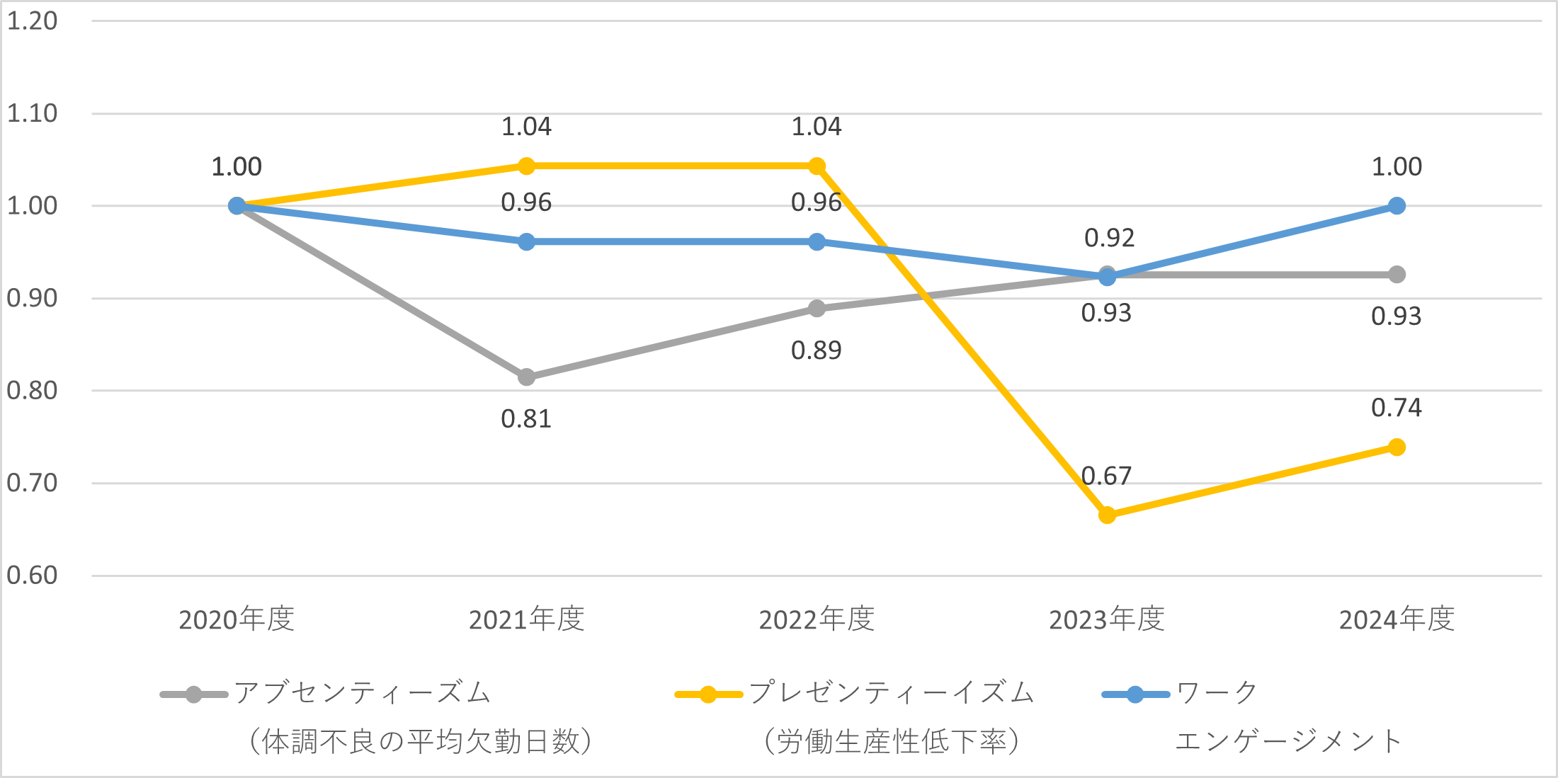 年一回の健康習慣アンケートより、アブセンティーイズム・プレゼンティーイズム・ワークエンゲージメントを算出し、こころとからだの健康支援に取り組んでいます。